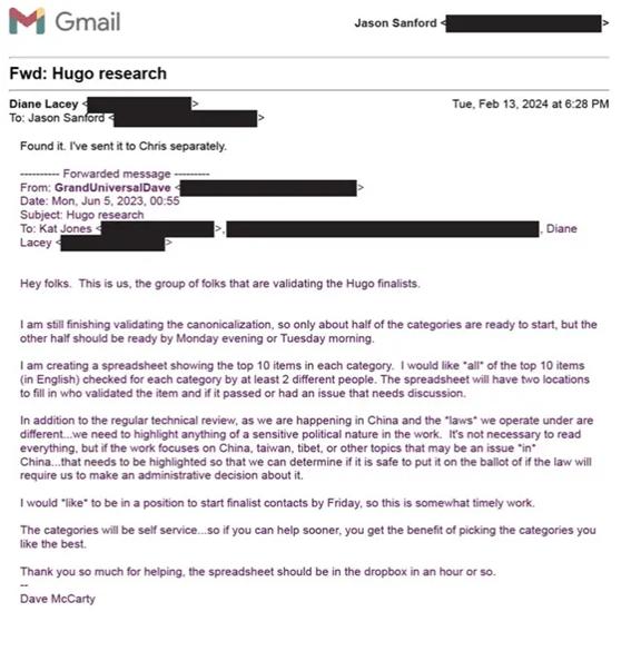 우선 중국에서 태어나 미국에서 활동 중인 작가 RF 쾅이 특별한 이유 없이 최종 후보 명단에서 제외된 데 대해 의혹이 제기됐습니다. 운영위 측이 중국 정부의 눈치를 보고 있다는 비판이 제기된 것입니다. 이 의혹은 2023년 휴고상 심사위원단의 메일이 유출되면서 사실로 드러났습니다.