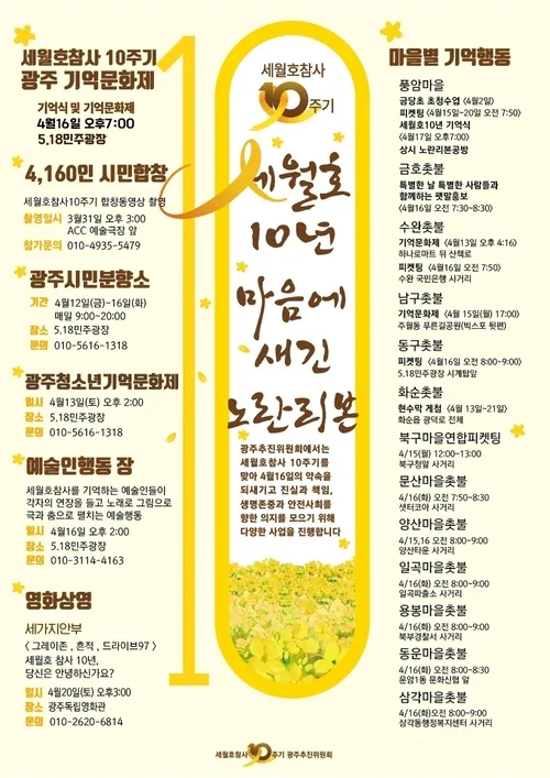 세월호 참사 10주기를 앞두고 광주·전남 곳곳에서도 추모 행사가 열렸습니다. 세월호 참사 10주기 광주추진위원회는 지난 12일 광주시 동구 5·18민주광장에 시민분향소를 마련했습니다. 추모객들은 16일까지 이곳에서 분향·묵념·노란 리본에 추모 메시지 전하기 등으로 희생자를 추모할 수 있다고 합니다.