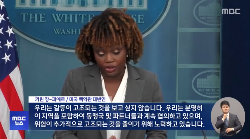 하지만 이스라엘은 지난 4월 19일 새벽(현지 시간) 이란 이스파한 지역에 대한 재보복 공습을 감행했습니다. 이에 대해 미국 백악관은 "코멘트할 것이 없다"는 입장을 반복했습니다. 그리고 카린 장-피에르 백악관 대변인은 브리핑에서 "우리는 갈등이 고조되는 것을 보고 싶지 않습니다. 우리는 분명히 이 지역을 포함하여 동맹국 및 파트너들과 계속 협의하고 있으며, 위험이 추가적으로 고조되는 것을 줄이기 위해 노력하고 있습니다."라며 확전을 반대한다는 메시지를 강조했습니다.
