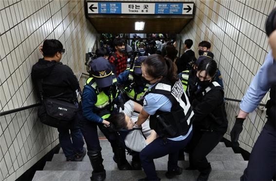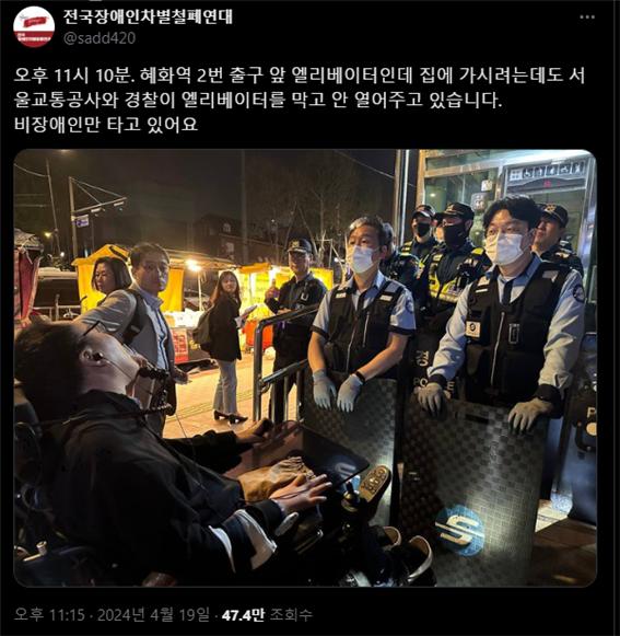 하지만 그들에게 돌아온 건 '무차별 연행'뿐이었습니다. 혜화역에 수많은 경찰이 모여 장애인들을 끌어냈습니다. SNS에 퍼진 여러 글에 의하면 혜화역 출구마다 장애인이 아닌 것을 확인한 뒤 역으로 입장하게 하는 차별 행위가 벌어져 시위와 상관없는 시민들조차 기분이 나빴다고 합니다. 이 정도의 경찰력을 10.29 참사 때 동원했더라면 안타까운 일을 막을 수 있었을 테죠.