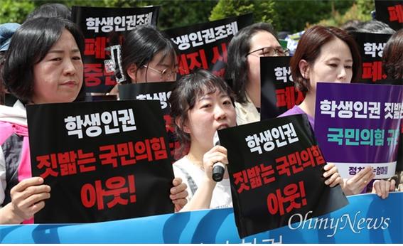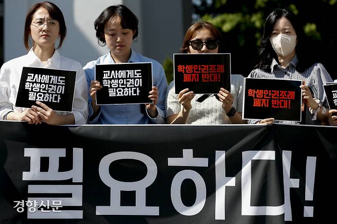 지난 13일 스승의 날을 앞두고 전국학생인권교사연대 등 교사단체 소속 교사들이 긴급기자회견을 통해 "교권 보호를 위해서라도 학생인권조례를 다시 돌려놔야 한다"고 지방자치단체와 교육당국에 촉구했습니다. 교사들은 성명서를 통해 "교사의 인권과 학생 인권은 대척점에 있지 않다"면서 "학생이 차별받지 않을 권리를 가진다는 내용의 조례는 교사의 그 어떤 권리도 제한하고 있지 않다"고 밝혔습니다. 《경향신문》 보도에 따르면 8년째 서울의 한 중학교에서 일하는 한채민 교사는 "2012년 서울학생인권조례가 제정되면서 학생을 때려서는 안 된다는 것이 상식이 된 학교 현장에서 안전하게 노동할 수 있었다"며 "그러나 이제 그러해야 할 근거를 어디에서 찾아야 하나"라고 말했다고 하죠.