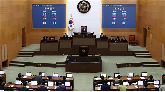 서울시의회는 본회의에서 서울특별시 학생인권조례 폐지조례안을 재석의원 60명 중 찬성 60명, 반대 0명, 기권 0명으로 가결했습니다. "의회 만장일치로 학생인권을 짓밟는 게 말이 되는가?" 하고 분노하는 분이 계시겠지만, 더불어민주당 소속 시의원들은 이날 폐지조례안 상정에 반발해 보이콧했습니다. 표결에 찬성한 60명은 전부 아이들과 젊은이들을 짓밟지 못해 안달인 국민의힘 소속 시의원이었습니다.