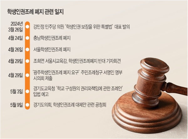최근 학생인권조례 폐지를 촉구하는 주민조례청구가 광주시의회에 접수됐습니다. 이 청구안을 낸 시민단체는 교권 보호와 학생들의 학업능력 저하 등을 이유로 꼽았다고 하죠. 특히 이 조례로 인해 학생들의 성정체성 혼란이 야기된다는 점을 강조했습니다. 조례안을 접수한 광주시의회는 검증 절차를 거쳐 오는 8월 청구안을 받아들일지 여부를 결정한다고 합니다. 충남과 서울에서 학생인권조례가 폐지되어 움직임이 전국으로 확산하는 분위기여서 지역사회의 갈등이 더 커질 것으로 보입니다. 전국 시·도 의회가 학생인권조례에 대한 진지한 고민 없이 정치적 이해관계에 따라 조례 폐지를 이어간다면 2026년 지방선거 이후 달라질 정치 지형도에 따라 학생인권조례가 부활하고 또 폐지되는 악순환에 빠질 가능성이 크다고 보는 것이 세간의 평가입니다.