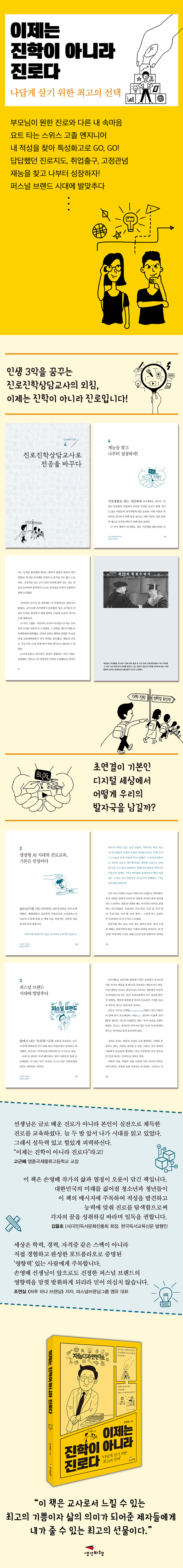 "이제는 대학이 아니라 직업입니다!", "이제는 대기업이 아니라 강소기업입니다!" 하고 학생과 학부모를 끊임없이 설득한 교사가 있습니다. 현대맨→스위스 엔지니어→특성화고 교사(기계전공)→학교기업담당교사→취업담당교사→진로진학상담교사→진로 전문 작가(유튜버·블로거)에 이르기까지 일곱 번 직무를 갈아타며 학생들에게 평생학습의 롤모델을 자처한 손영배 작가입니다.