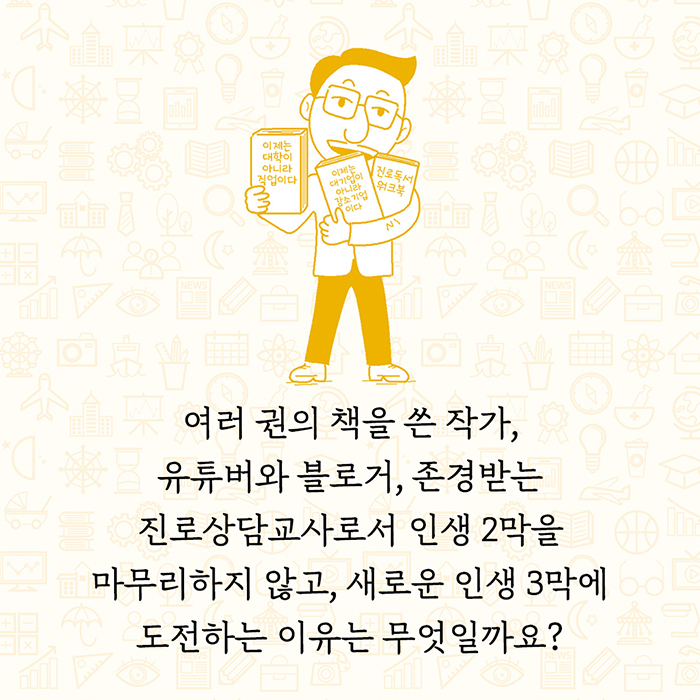 이번에 출간한 《이제는 진학이 아니라 진로다》에는 학생들보다 한발 앞서 다양한 진로를 선택하고 체험한 삶의 이야기를 담아냈습니다. 인생 1막이 직장생활까지였고, 2막이 교직생활까지였다면, 3막은 청소년의 재능을 찾아내고 디자인하는 진로직업상담 전문가로 살아갈 예정입니다.