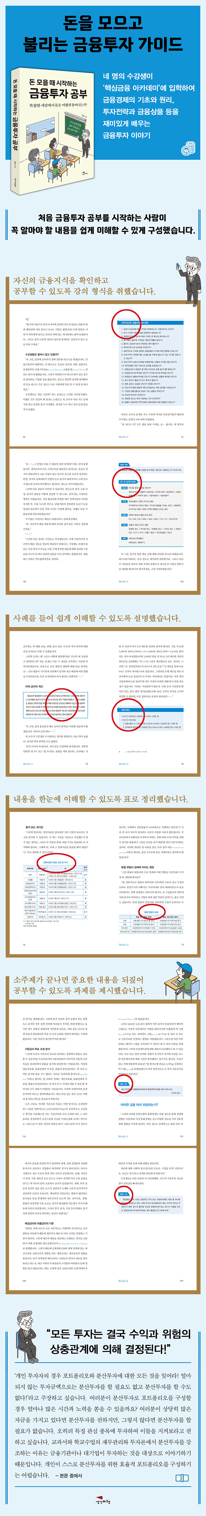 《돈 모을 때 시작하는 금융투자 공부》는 금융투자를 처음 접하거나 시작한 지 얼마 되지 않은 투자자를 위해 2주간의 강의 형식을 취했습니다. 1주 차 강의는 금융 마인드를 세우기 위한 경제학적 생각의 기초를 다지고 금리, 통화량, 각종 경제지표를 찾아 읽는 법, 환율, 금융시장, 통화정책, 의사결정 등 금융투자에 대한 기초를 튼튼히 하는 내용으로 채웠습니다. 2주 차 강의는 금융투자에 대한 이론과 전략을 소개하며 주식, 채권, 펀드, 파생상품, 구조화상품 등을 설명합니다. 또한 두 번의 퀴즈를 통해 중요한 부분을 다시 짚습니다. 나무의 뿌리가 튼튼해야 바람을 견디고 가뭄을 이겨 내듯이 금융투자도 굳건한 금융 마인드 위에 쌓은 기초 지식이 튼튼해야 위험을 견디며 자신이 원하는 수익에 도달할 수 있습니다.
