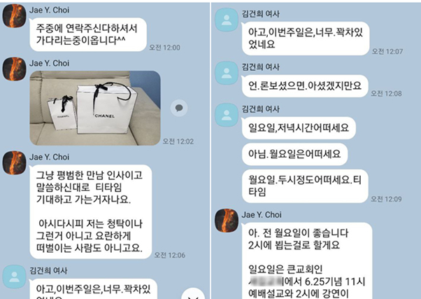 2022년 9월 최재영 목사는 김건희 여사가 대표로 있던 코바나컨텐츠 사무실에서 김 여사에게 300만 원 상당의 명품 가방을 건네며 손목시계형 몰래카메라로 이 과정을 촬영해 폭로했습니다. 곤란한 상황을 일부러 만들어 대뜸 명품 가방을 안긴 것이 아니라 사전에 김 여사를 보좌하는 측근에게 카카오톡으로 명품 가방 사진을 보내고 접견 일정까지 조율했습니다.