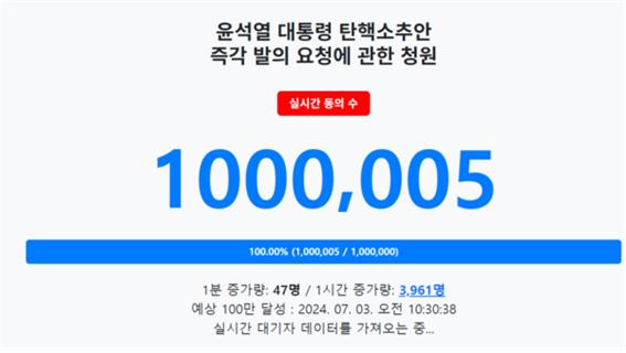 특히 지난 6월 26일부터 청원 동의자 수가 급증하기 시작했는데요, 윤석열의 이태원 참사 조작 망언이 폭로되면서부터는 50만 명을 돌파했습니다. 갑자기 국민들의 관심이 쏠리자 국회 국민동의청원 홈페이지 접속이 지연되기도 했습니다. 이 때문에 탄핵 동의 서명을 못 하게 하려는 대통령실의 입김이 작용한 게 아니냐는 의혹이 제기됐다가 6월 30일 국회의원실에서 서버 증설 등 적극적인 개선책을 내놓으면서 잦아들었습니다.