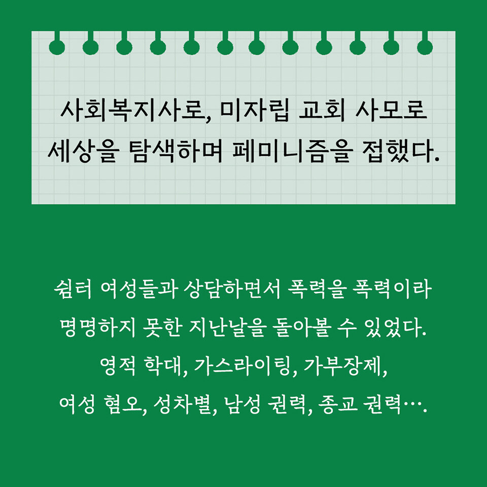 저자 인생의 분기점인 2002년 시점으로 1장을 시작합니다. 2장은 사랑과 헌신의 30대 목사 사모 이야기로 ‘그림자’ 생활을 돌아봅니다. 3장은 1980년대 한국 사회와 선교 단체를 배경으로 좌충우돌하는 20대 생활을 통해 지금도 우리 사회에 만연한 여성 혐오와 가스라이팅을 보여 줍니다. 4장은 익숙한 것들을 의심하며 다시 묻고 공부하며, 주도적으로 세상을 탐색하고 자기 목소리를 찾아가는 저자의 40대 모습을 그렸습니다. 5장은 50대 이후 암 수술을 겪으면서 몸과 마음이 변화하여 본격적인 인생 후반전을 뛰는 활력적인 현재 모습을 담았습니다.