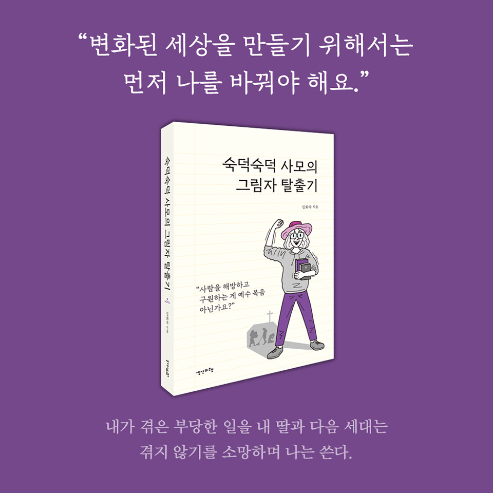 《숙덕숙덕 사모의 그림자 탈출기》는 폐쇄적이고 가부장적인 선교 단체에서 자기를 버리고 낮추기를 강요당하며 익숙하게 살아온 환경을 벗어난 목사 사모의 이야기이며, 부당한 그림자 노동과 각종 폭력에 노출된 현실에 대항하는 여성의 이야기이며, 끊임없이 변화하며 주변을 변화시키고 세상을 변화시키고자 노력하는 60대 페미니스트의 당당한 이야기입니다.