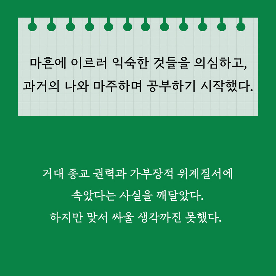 저자 인생의 분기점인 2002년 시점으로 1장을 시작합니다. 2장은 사랑과 헌신의 30대 목사 사모 이야기로 ‘그림자’ 생활을 돌아봅니다. 3장은 1980년대 한국 사회와 선교 단체를 배경으로 좌충우돌하는 20대 생활을 통해 지금도 우리 사회에 만연한 여성 혐오와 가스라이팅을 보여 줍니다. 4장은 익숙한 것들을 의심하며 다시 묻고 공부하며, 주도적으로 세상을 탐색하고 자기 목소리를 찾아가는 저자의 40대 모습을 그렸습니다. 5장은 50대 이후 암 수술을 겪으면서 몸과 마음이 변화하여 본격적인 인생 후반전을 뛰는 활력적인 현재 모습을 담았습니다.