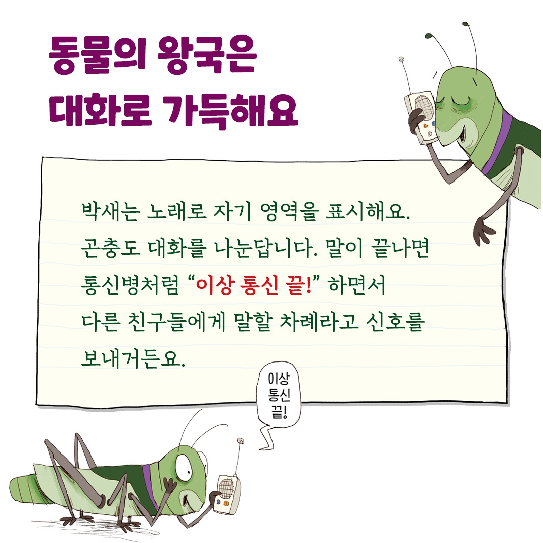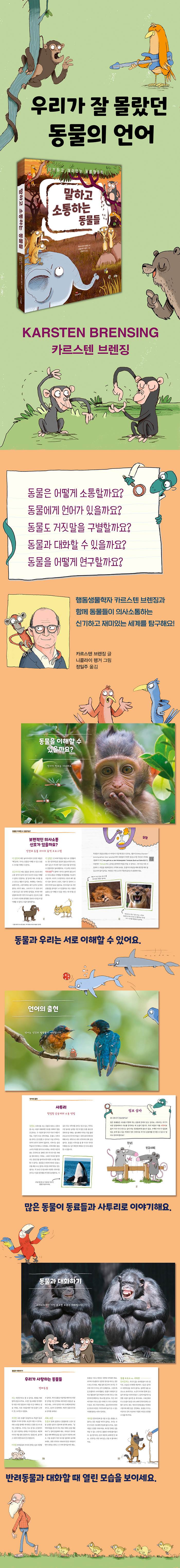 《말하고 소통하는 동물들》은 우리가 잘 모르는 동물들의 흥미로운 의사소통 방법을 소개합니다. 박새는 문법 규칙을 알고, 고래는 1000킬로미터가 넘게 떨어져 있어도 대화할 수 있습니다. 연구원과 대화를 나누는 앵무새, 동료에게 포식자가 온다는 위험을 알리며 경고하는 미어캣, 사람처럼 관용구를 사용하는 원숭이도 있지요. 행동생물학자 카르스텐 브렌징은 다양한 사례를 통해 우리가 동물을 이해할 수 있는지, 동물과 대화를 나눌 수 있는지, 동물의 언어를 어떻게 연구할 수 있는지, 쉽고 재미있게 알려 주며 동물행동학의 놀라운 세계로 우리를 안내합니다.