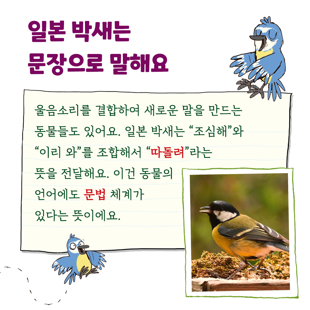 개는 “멍멍”, 고양이는 “야옹” 하고 웁니다. 아무리 똑똑한 강아지라도 고양이의 울음소리를 배워서 낼 수는 없죠. 하지만 다른 동물의 울음소리나 새로운 종류의 소리를 배우는 능력이 뛰어난 동물들도 있습니다. 앵무새, 찌르레기, 어치, 박새, 돌고래, 물개 등은 인간의 말은 물론 다양한 소리를 배워서 낼 수 있답니다.