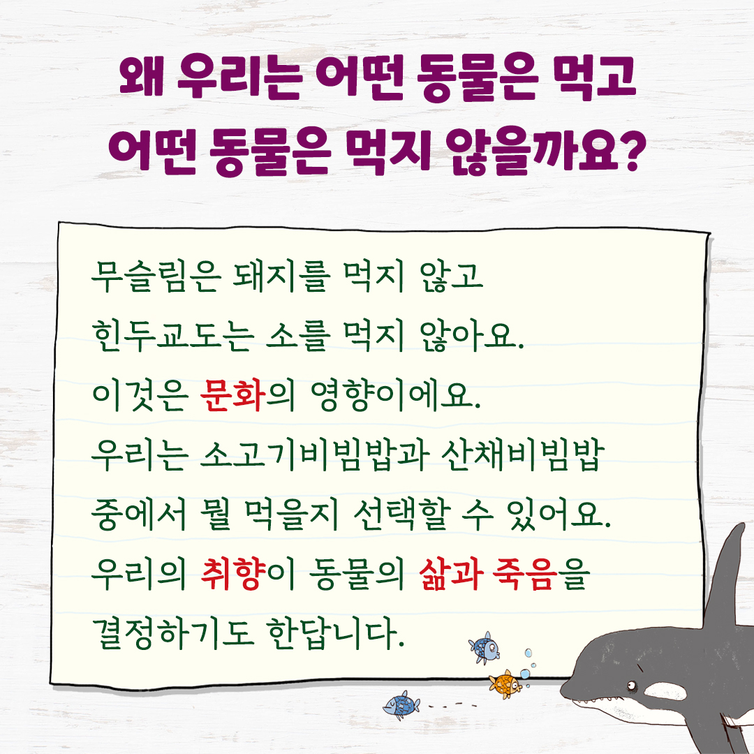 왜 우리는 어떤 동물은 먹고 어떤 동물은 먹지 않을까요? 무슬림은 돼지를 먹지 않고 힌두교도는 소를 먹지 않지요. 이것은 종교와 문화의 영향입니다. 동물에게도 문화가 있습니다. 물개 같은 포유류만 잡아먹는 범고래가 있는가 하면 오직 물고기만 먹는 범고래도 있거든요. 그러니까 범고래 무리는 자신들만의 식문화를 유지하고 있는 셈이죠. 범고래의 습성은 평생 변하지 않지만 우리 인간들은 소고기비빔밥과 산채비빔밥 중에서 뭘 먹을지 선택할 수 있습니다. 우리의 취향이 동물의 삶과 죽음을 결정하기도 하는 것이지요.