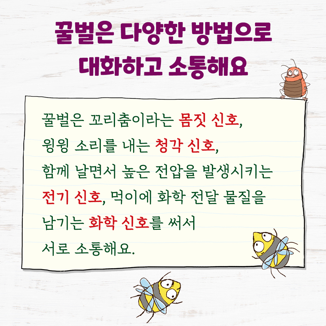 꿀벌은 그들만의 비밀 언어를 가지고 있습니다. 꼬리춤으로 먹이가 어떤 방향에 있는지, 얼마나 떨어져 있는지를 동료에게 전달합니다. 원격으로 조종되는 로봇 꿀벌이 윙윙 소리를 내면 꿀벌들은 동료로 받아들입니다. 먹이가 있는 거리에 따라 꿀벌 떼는 400볼트가 넘는 전압을 발생시키기도 합니다. 발견한 먹이에 화학 전달 물질을 남겨 뒤따르는 동료가 쉽게 찾을 수 있게 돕기도 합니다. 이렇게 꿀벌은 몸짓 신호, 청각 신호, 전기 신호, 화학 신호 같은 다양한 방법으로 동료들과 소통합니다.
