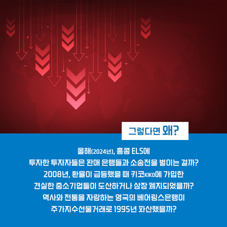 투자에 관심이 있는 사람이라면 2024년 홍콩주가연계증권(ELS)에 투자했다가 손실을 본 투자자들이 판매 은행들을 상대로 소송전을 벌인다는 내용을 방송이나 기사로 접했을 것입니다. 이를 다룬 많은 기사 중에는 2008년 글로벌 금융위기 때 견실한 중소기업들이 통화를 기초자산으로 하는 키코(KIKO)에 가입했다가 환차손으로 흑자 도산하거나 상장 폐지된 아픈 기억을 되살리는 내용도 있었습니다. 2004년 ELS와 2008년 키코는 파생금융상품이라는 공통점이 있습니다. 설립한 지 200년 넘는 영국의 베어링스은행이 1995년 파산한 까닭도 파생금융상품인 주가지수선물 때문이었죠. 일반 투자자들은 이러한 사례들을 알고 있더라도 자신이 직접 겪지 않았기 때문에 먼 나라, 혹은 과거의 일로 치부하기 쉽습니다. 하지만 이러한 일은 반복되기 마련입니다. 지금 소송으로 시끄러운 ELS 역시 2015년과 2020년 초 홍콩H지수가 폭락하면서 투자자들의 가슴을 졸이게 했습니다. 다행히 위기를 모면하면서 큰 문제가 생기지 않고 넘어갔지만 파생금융상품에 투자하는 사람이라면 잊어서는 안 될 장면이었습니다. 한편 2008년 글로벌 금융위기 진행 과정에서도 신용부도스왑(CDS)과 부채담보부증권(CDO)이 위기를 확산하는 기폭제가 되었습니다. 그 결과 미국 최대 보험회사인 AIG가 파산 직전까지 몰리자 미국 연방정부는 공적 자금을 투여할 수밖에 없었고, 세계 경제는 글로벌 금융위기라는 소용돌이에 휘말리고 말았습니다.
