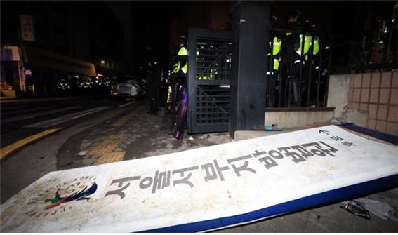 서부지법에 난입한 폭도들은 소화기나 벽돌 등 사람이 다칠 수도 있는 무거운 물체를 내던져 법원 유리창과 시설물을 차례차례 부쉈습니다. 이들을 저지하려는 경찰을 향해 물건을 집어던지고 경찰 방패를 빼앗아 내려치는 등 폭력을 행사해 경찰 두 명이 중상을 입기도 했죠.