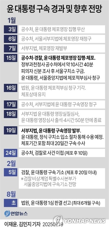 통상 구속 기간은 체포 시점으로부터 최장 20일이기 때문에 이 안에 윤석열에 대한 공소 제기가 이뤄질 전망입니다. 대략 2월 첫째 주 정도까지가 구속 기간인데, 검찰이 공수처에서 사건을 이첩받아 구속 기간 연장을 신청한다면 늘어날 수도 있습니다. 하지만 윤석열을 맹신하는 폭도들이 배후인 국민의힘과 극우 세력의 부추김을 받아 언제 다시 폭동이 벌어질지 모를 일이어서 안심하기 이릅니다.