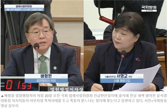 국회에서 배형원 법원행정처 차장 역시 서부지법 사태를 '폭동'으로 규정했습니다. 대한민국 역사상 법원이 이렇게 습격당한 전례가 없다며 이런 일이 절대로 있어서는 안 된다고도 했습니다.