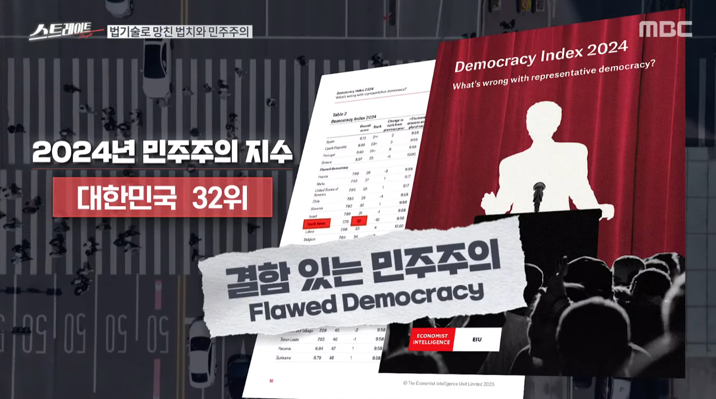 지난 4월 6일 MBC 탐사기획 스트레이트는 <아직, 끝나지 않았다 파면된 자가 남긴 청구서>라는 방송에서 윤석열이 남긴 숱한 과제를 세세하게 다뤘습니다. 스웨덴 민주주의 다양성 연구소는 지난 2년의 한국을 '독재화가 진행 중인 나라'로 평가했다고 합니다. 또한 영국 이코노미스트 산하 연구소가 발표한 민주주의 지수에서 우리나라는 '결함 있는 민주주의 국가'로 강등됐다고 합니다. 이것이 바로 윤석열이 주장한 경고성 계엄과 법치의 초라한 성적표입니다.