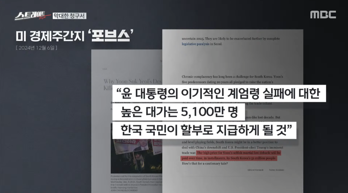 그뿐이 아닙니다. 지난해 12월 2일 윤석열은 소상공인과 자영업자를 불러 회복과 도약을 약속했습니다. 하지만 바로 다음 날 비상계엄이 선포되면서 자영업자들은 연말 특수를 완전히 날려버렸습니다. 내란 이전인 11월 570만 명이었던 자영업자 수는 지난 1월 550만 명으로 두 달 만에 20만 명이나 줄었다고 하죠. 미 경제주간지 《포브스》의 수석 기고자 윌리엄 페섹은 지난 2024년 12월 6일(현지시간) "윤석열 대통령의 이기적인 계엄령 시도의 대가는 한국의 5100만 국민이 시간에 걸쳐, 할부로 치르게 될 것"이라며 내란 사태를 강하게 비판하기도 했죠.