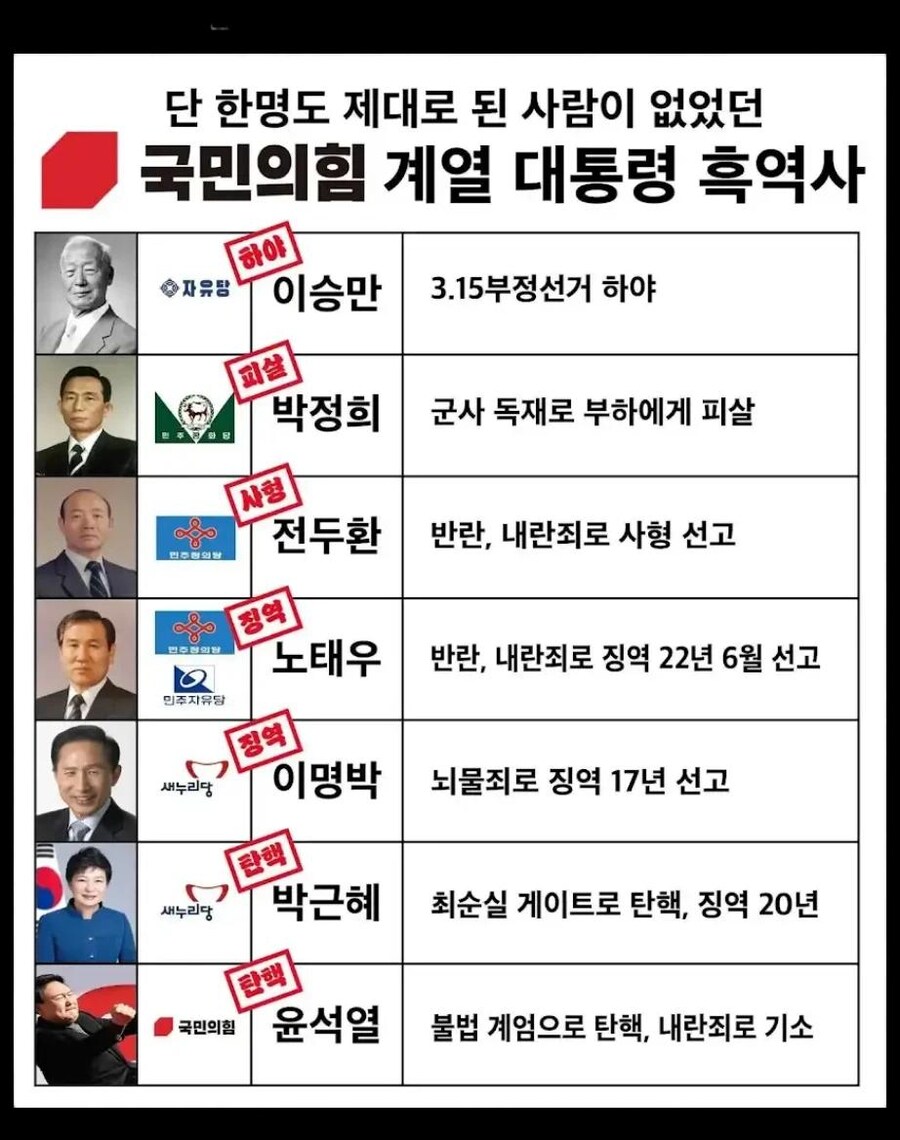 내란죄로 정당 해산해야 마땅한 국민의힘은 뻔뻔하게도 대선 후보로 나선 이들의 진흙탕 싸움으로 바람 잘 날이 없습니다. 국민의힘 소속 대선 후보 중에서 윤석열의 패악이나 내란에 대해 제대로 사과하는 이는 없습니다. 애초 국민의힘 쪽 계열에 속한 대통령 중 제대로 된 사람이 없었습니다. 이들에게 뭔가 기대를 한다는 것 자체가 문제입니다. 하나 같이 자기 영달에 빠져 국민의 안위는 관심 밖입니다.