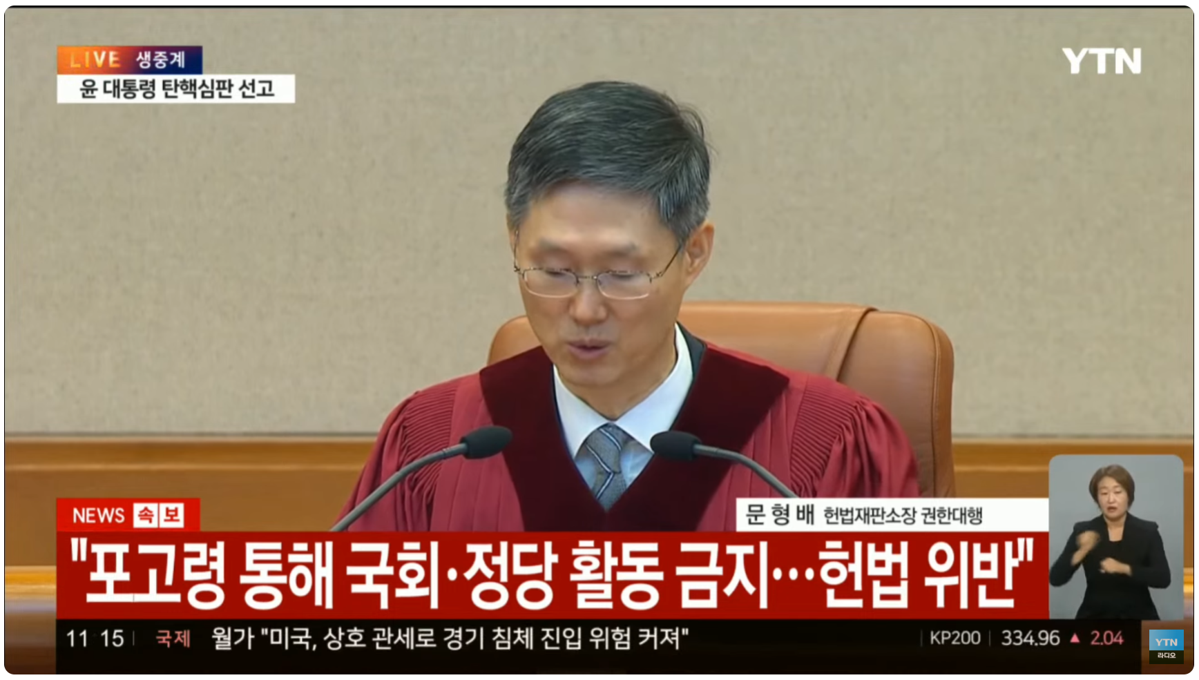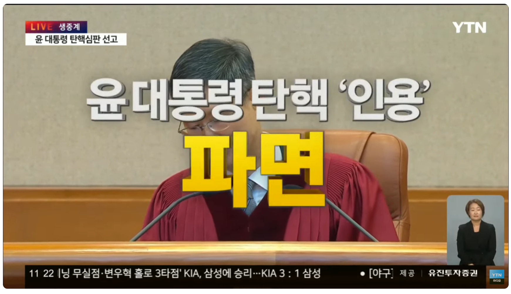 2025년 4월 4일 오전 11시 22분, 헌법재판소는 윤석열에 대한 탄핵소추안을 재판관 전원일치로 인용했습니다. 이에 따라 윤석열은 대통령직에서 즉시 파면됐습니다. 선고문에는 윤석열이 '국민의 신임을 중대하게 배반'했다며, '윤석열 대통령의 위헌, 위법 행위는 헌법 수호 관점에서 용납할 수 없는 중대한 법 위반'이기에 '파면하여 얻는 헌법 수호의 이익이 국가 손실을 압도할 정도로 크다'라고 적시했습니다.