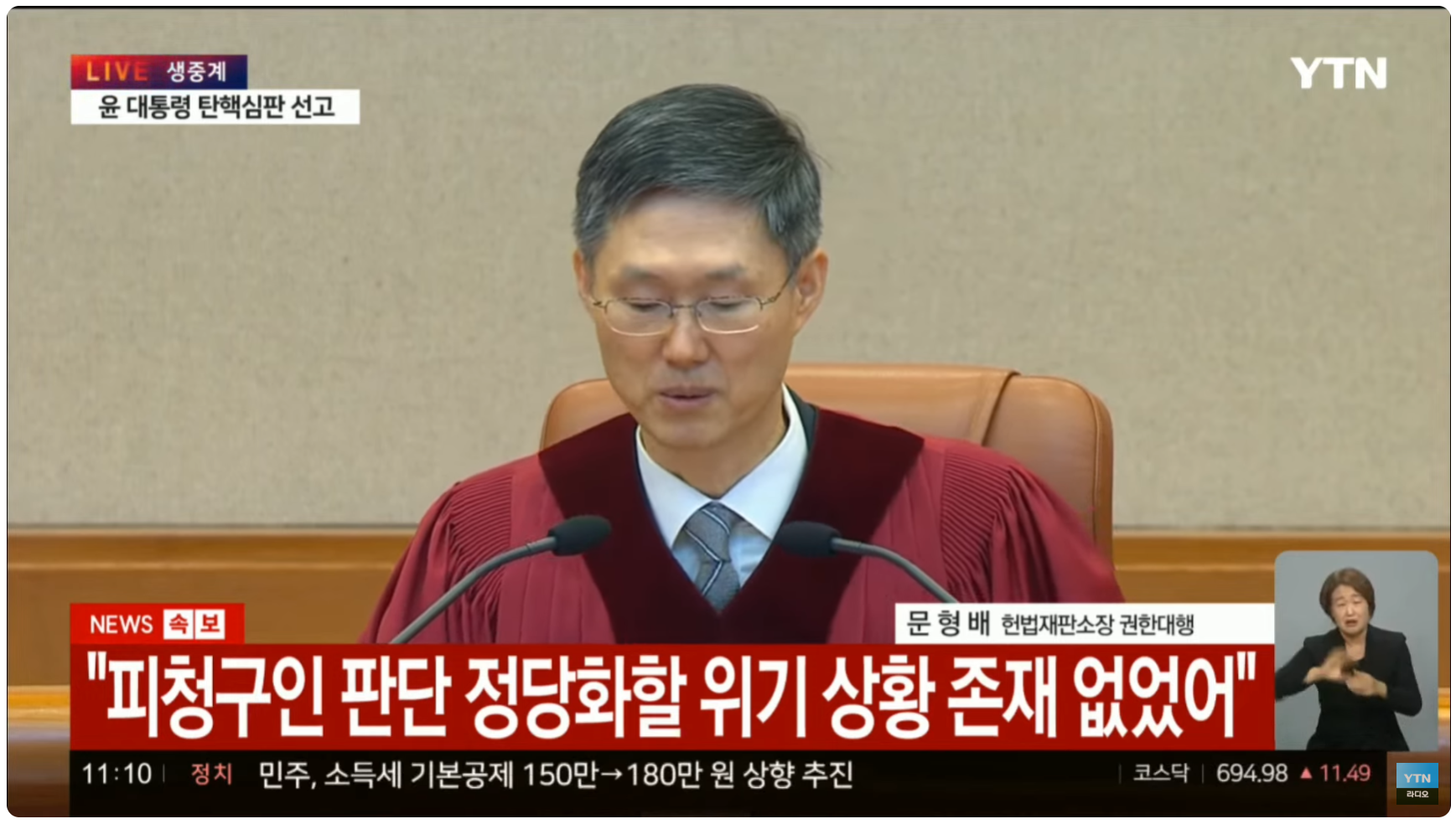 때문에 헌법재판소는 윤석열을 파면함으로써 얻는 헌법 수호의 이익이 대통령 파면에 따라는 국가적 손실을 ‘압도’할 정도로 크다고 인정한 것입니다.
