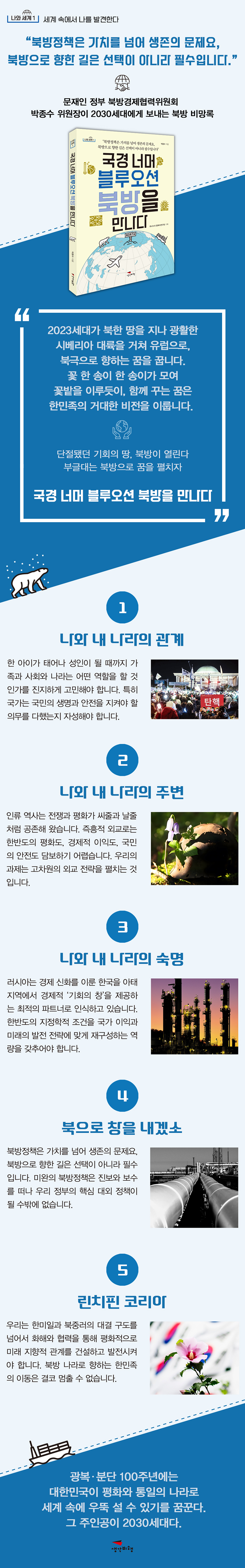 문재인 정부에서 신북방정책을 총괄하며 ‘북방외교의 기수’로 활약한 박종수 북방경제협력위원회 위원장(부총리급)이 기회의 땅 북방으로 꿈을 펼치자는 제언을 담은 북방 비망록을 펴냈습니다. 《국경 너머 블루오션 북방을 만나다》에서 저자는 2030세대가 북한 땅을 지나 광활한 시베리아 대륙을 거쳐 유럽으로, 북극으로 향하는 꿈을 꾼다고 포부를 밝힙니다. 남북한이 주도하고 주변국이 협력할 때 얻게 될 미래 가치가 엄청나다면서 대한민국이 평화와 통일의 나라로 세계 속에 우뚝 서게 할 주인공으로 2030세대에 주목했습니다.