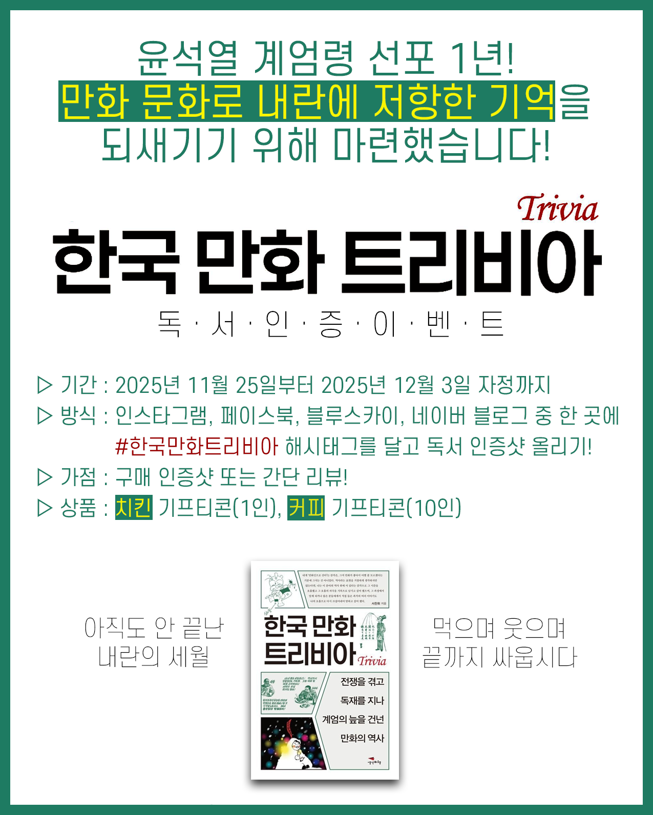 참여 방법은 간단합니다. 2025년 11월 25일부터 내란 발발의 날인 12월 3일 자정까지 인스타그램·페이스북·블루스카이·네이버 블로그 중 한 곳에 #한국만화트리비아 해시태그를 달고 독서 인증샷 올리기!