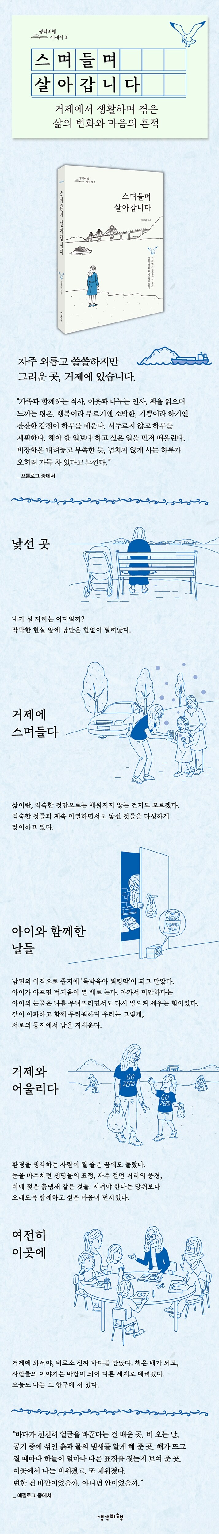 삶의 무대가 바뀌거나 뭔가 새로운 일을 시작할 때, 많은 사람이 외롭고 불안하고 두려움에 주춤한다. 자신의 자리가 어디일까 고민하면서도 막상 무엇을 해야 할지 헛갈리며 판단마저 무뎌진다. 저자 역시 거제라는 낯선 곳에서 방황했다. 그는 낯섦을 이해하려고 애쓰며, 이름조차 붙이기 어려운 흐릿한 감정을 면밀히 관찰하며 나아갔다. 그 변화 흔적을《스며들며 살아갑니다》에 고스란히 녹여냈다. 과거의 상처, 편견, 사람과의 관계로 고민하거나 자책하는 이들에게 이 책을 위로의 메시지로 권한다. 독박육아 워킹맘이 낯선 생활에 적응하는 일상 이야기를 보다 보면 자신의 삶을 따뜻하고 다정하게 바라보는 눈을 뜨게 된다. 자기만의 속도로 살아갈 용기도 얻게 된다.