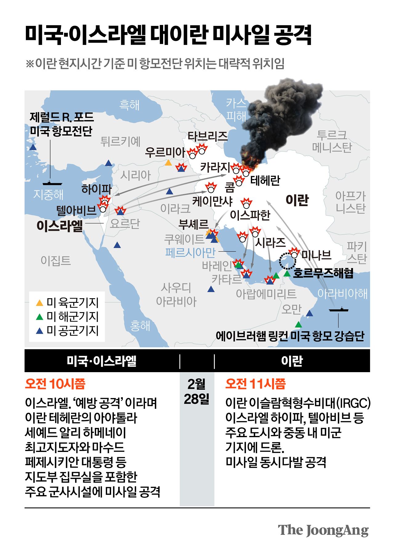2월 28일 현지 시각 오전 9시 45분, 이스라엘과 미국의 합동 공습이 이란 전역에서 동시에 시작됐습니다. 이스라엘 공군은 전투기 약 200대를 투입해 이란 서부·중부의 군사 목표물 500여 곳을 타격했고 미 해군의 전투기도 항공모함에서 출격했습니다. 엄청난 공습으로 이란 최고 지도자 알리 하메네이가 사망했고, 혁명수비대 사령관 모하마드 파크푸르, 군 최고사령관 압돌라힘 무사비 등 다수의 이란 군 수뇌부도 사망했습니다. 트럼프는 이 공습의 목적을 이란의 정권 교체라고 공개적으로 시사했습니다. 이스라엘은 이 작전을 '포효하는 사자 작전(Operation Roaring Lion)'으로 명명했고요.