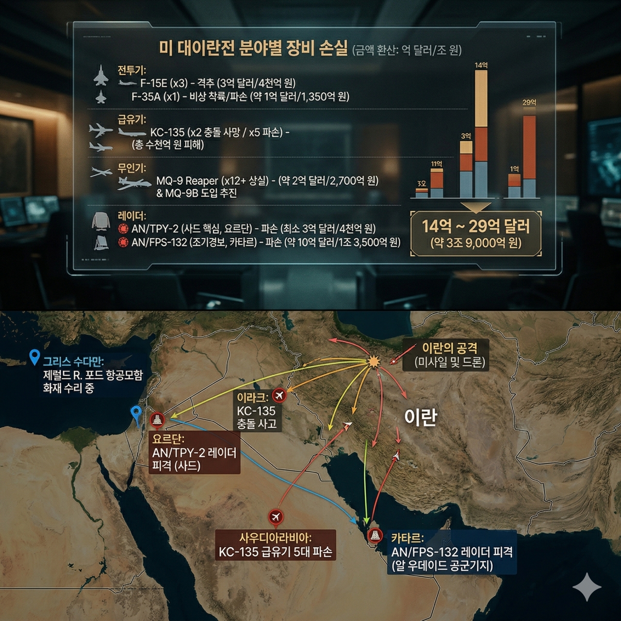 그런데 주목할 점은 이란의 군사 기술이 정밀해졌다는 사실입니다. 이란의 미사일 공격이 과거에 비해 정확도 상당히 높아진 모습을 보이고 있습니다. 이 때문에 러시아가 미군 자산의 위치 정보를 실시간으로 제공한다는 주장도 제기되고 있죠. 이란이 단순한 재래식 군사력이 아니라 러시아·중국과 암묵적 연계를 통해 비대칭 전력을 키우고 있다는 점은 전쟁의 양상을 더욱 복잡하게 만드는 요인입니다.