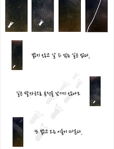연재물311 《오동명의 바다소풍 9》남자 엿보기 2 두 남자가 걷고 있습니다. 제주도 산방산과 단산 사이 선뮤지엄(명상학교)을 출발한 이들은 시계방향으로 제주도의 바닷가를 한 바퀴 돕니다. 침묵하며 걷지만 이들은 몸으로 말합니다. “지구야, 미안해.” “자연아, 사랑해.” 이들과 동행할 수 없었던 어떤 남자가 노래 하나를 띄워 보냅니다. 천 번이고 다시 태어난대도 그런 사람 또 없을 테죠. 슬픈 내 삶을 따뜻하게 해준 참 고마운 사람입니다. 그런 그댈 위해서 나의 심장쯤이야 얼마든 아파도 좋은데 사랑이란 그 말은 못해도 먼 곳에서 이렇게 바라만 보아도 모든 걸 줄 수 있어서 사랑할 수 있어서 난 슬퍼도 행복합니다. 나 태어나 처음 가슴 떨리는 이런 사람 또 없을 테죠. 몰래 감춰둔 오랜 기억 속에 단 하나의 사랑입니다. 그런 그댈 위해서 아픈 눈물쯤이야 .. 2011. 5. 30. 《오동명의 인생사계 2》실수가 낳은 기초 2011. 5. 27. 《오동명의 바다소풍 8》남자 엿보기 1 한 남자가 바닷가에 혼자 앉아 있다. 바다는 파도로 육지를 향하고 남자는 잃어버린 시간으로 과거에 묶이지만 육지로도 과거로도 건너가지 못한다. 들고나는 파도로 잃어버린 시간을 다시 짓고 다시 지운다. 바다가 남자를 꼼짝없이 잡아놓은 세 시간. 멀리서 밀려오는 첫 파도가 바닷가에 미치기 전에 남자는 바다 언저리에서 일어난다. 한라산에 눈을 두고 바닷가를 끼고 걷기 시작한다. 남자가 다시 앉아 쉴 터는 그도, 나도, 그 누구도, 모른다. 과거는 돌이키지 못해도 또 걸을 뿐이고 바다는 깨어져도 또 파도로 일 뿐이다. 마냥, 마냥, 마냥... 그저, 그저, 그저... 흰 거품으로 일 때만 파도이듯 과거는 앉아 있는 시간만큼만 유효하다. 2011. 5. 23. 《오동명의 인생사계 1》흔적으로 남는 길 * 돌판화를 시작합니다. 신문의 시사만화와 같이 4면으로 구성할 생각입니다. 기승전결(起承轉結)이라 해도 좋고, 희로애락(喜怒哀樂)이라 해도 좋고, 생세지락(生世之樂)으로 여겨도 좋습니다. 생각비행 홈페이지에 걸맞게 생각의 시간과 공간-생각으로 비행하는-이 되기 바랍니다. 오동명 한 사람의 주관이 아니라 보는 이가 마음껏 함께 상상하는 자리가 되면 더 좋겠습니다. 2011. 5. 20. 이전 1 ··· 53 54 55 56 57 58 59 ··· 78 다음